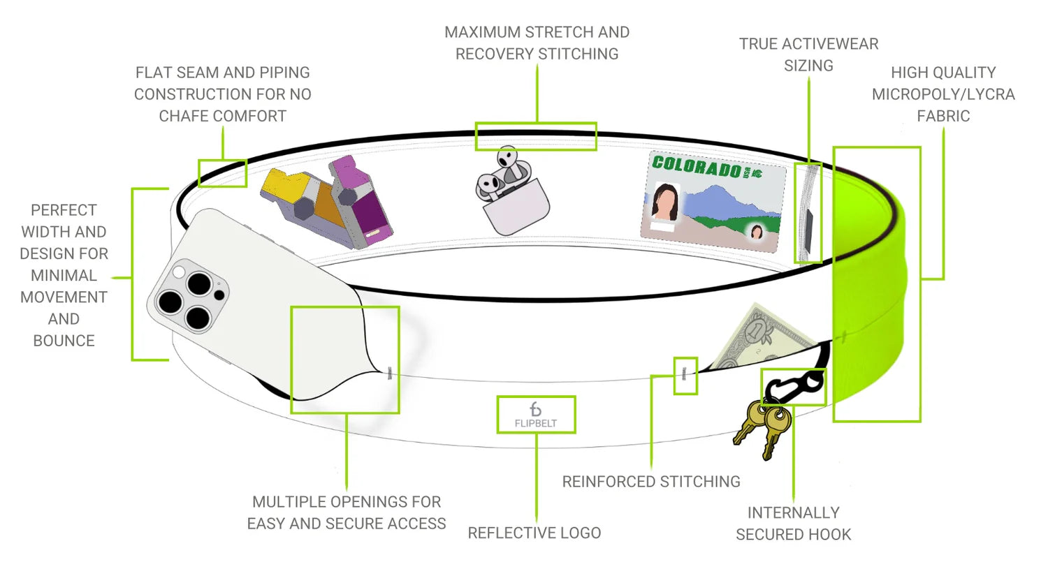 • Fitnessbältet FlipBelt är ett alternativ till skrymmande löparmband och magväskor. Till skillnad från dessa gamla lösningar är FlipBelt lätt, studsar inte och passar bekvämt ALLA dina personliga måste-ha-prylar med dig. Det är den perfekta lösningen för en mängd olika användningsområden, inklusive fitness, medicin, resor, livsstil och mer. Bär din telefon och nycklar medan du springer eller tränar och ha alltid din inhalator, EpiPen och diabetestillbehör inom räckhåll.
